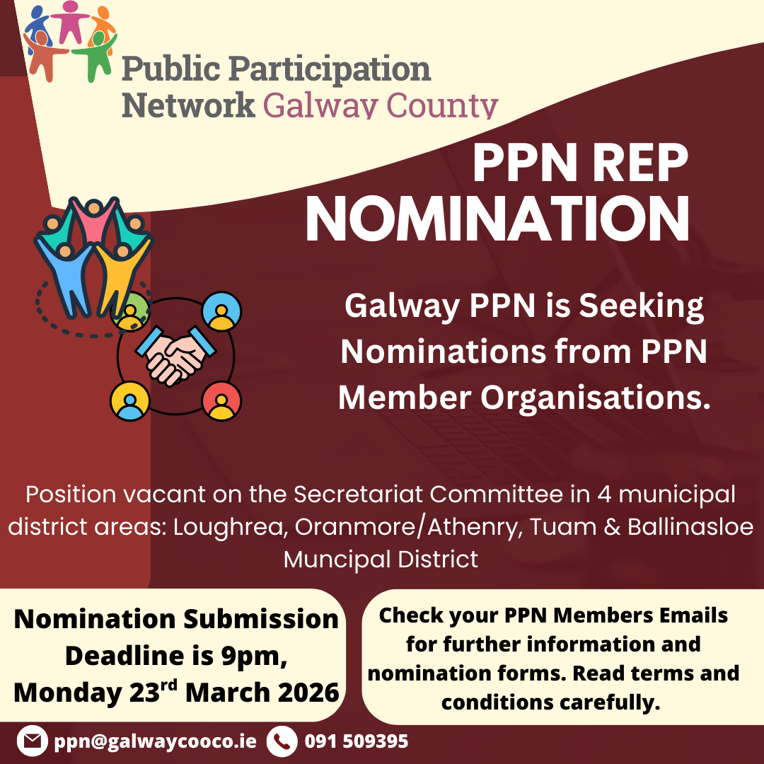 Galway County PPN (Public Participation Network) has been established to enable people and community groups in Co Galway to have a say on issues that concern them. These Public Participation Networks (PPNs) are new structures for public engagement and participation in Local Government in each Local Authority area.