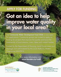 The Local Authority Waters Programme (LAWPRO) has launched the Community Water Development Fund for 2026 and are welcoming grant applications from community groups nationwide. The Community Water Development Fund enables community groups to enhance the quality of local streams, rivers, lakes, and coastal areas. Under the fund local communities and groups are invited to apply for financial assistance to support the delivery of projects and initiatives to enhance water bodies and benefit water quality and biodiversity.